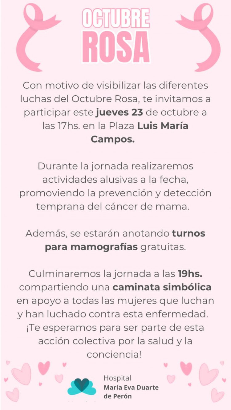 Este jueves 23 de octubre, desde las 17 horas, la Plaza Luis María Campos será el punto de encuentro para una nueva jornada del Octubre Rosa, una iniciativa que busca concientizar sobre la prevención y detección temprana del cáncer de mama.